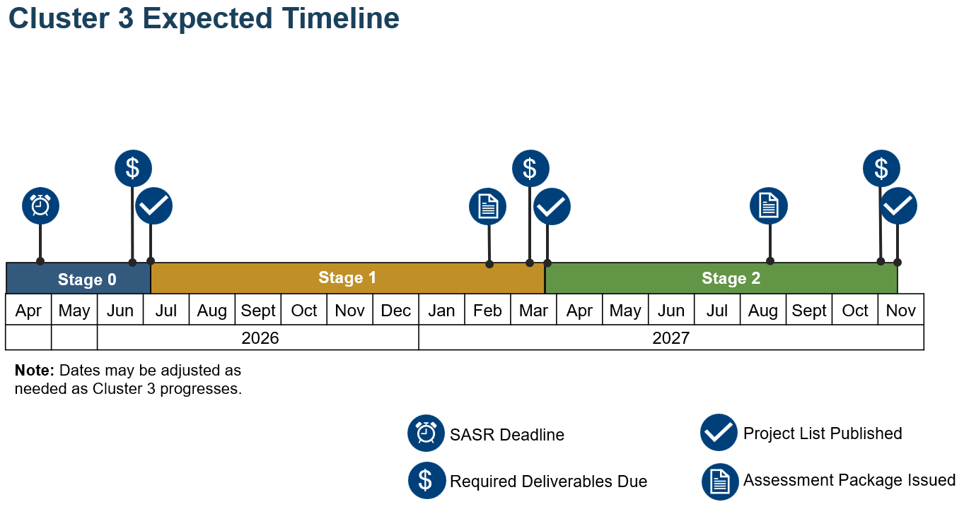 To accommodate the completion of studies that consider the expected project cancellations in late 2025/early 2026, we have extended the SASR submission deadline for Cluster 3 from February to April 2026.