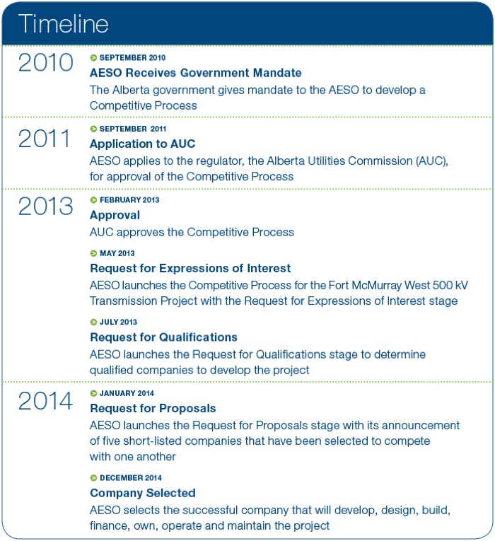 The Request for Qualifications stage commenced in July of 2013 and concluded in December of 2013. The AESO provided draft project agreements at this stage to allow bidders an early look at the AESO’s proposed risk allocation. Five world-class teams that met the AESO’s criteria were short-listed and were invited to submit technical proposals as well as a price for FMW.