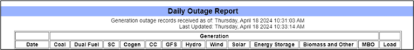 - Daily Outage Report – Gas fuel type will be replaced by new columns ‘SC’ (Simple Cycle), 'Cogen’ (Cogeneration), 'CC’ (Combined Cycle) and ‘GFS’ (Gas Fired Steam). New ‘MBO’ (Mothball Outage) column indicating aggregated MWs on mothball outage.