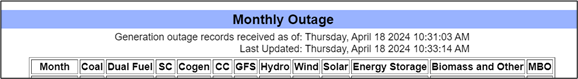 - Monthly Outage Report – Gas fuel type will be replaced by new columns ‘SC’ (Simple Cycle), 'Cogen’ (Cogeneration), 'CC’ (Combined Cycle) and ‘GFS’ (Gas Fired Steam). New ‘MBO’ (Mothball Outage) column indicating aggregated MWs on mothball outage.